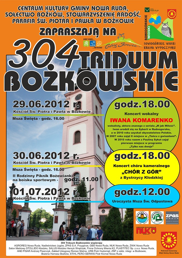 Centrum Kultury Gminy Nowa Ruda, Sołectwo Bożków, Stowarzyszenie Radość, Parafia Św. Piotra i Pawła w Bożkowie zapraszają na 304 Triduum Bożkowskie. Organizatorzy zapewniają trzy dni dobrej zabawy oraz chwile relaksu przy koncertach i pikniku.
