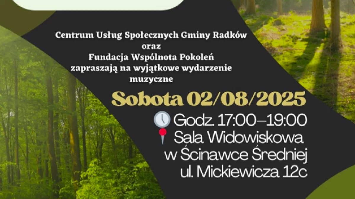 Centrum Usług Społecznych Gminy Radków oraz Fundacja Wspólnota Pokoleń zapraszają na niezwykłe wydarzenie muzyczne. W sobotę, 2 sierpnia, od godziny 17:00 do 19:00 w Sali Widowiskowej w Ścinawce Średniej przy ul. Mickiewicza 12c wystąpi znany i ceniony zespół wokalny „Leśne Echo".