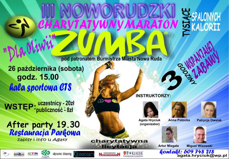W najbliższą sobotę (26 października) o godz. 15.00 odbędzie się III Noworudzki Charytatywny Maraton Zumba (hala sportowa CTS). 3 godziny zabawy gwarantują tysiące spalonych kalorii. Bilety w cenie - 20 zł. za uczestnictwo/ 8 zł. publiczność. Po imprezie odbędzie się After Party o 19.30 w Restauracji "Parkowa". Instruktorzy: Agata Hryciuk, Anna Potocka, Patrycja Owsiak, Artur Mizgała, Miquel Wizowski.
