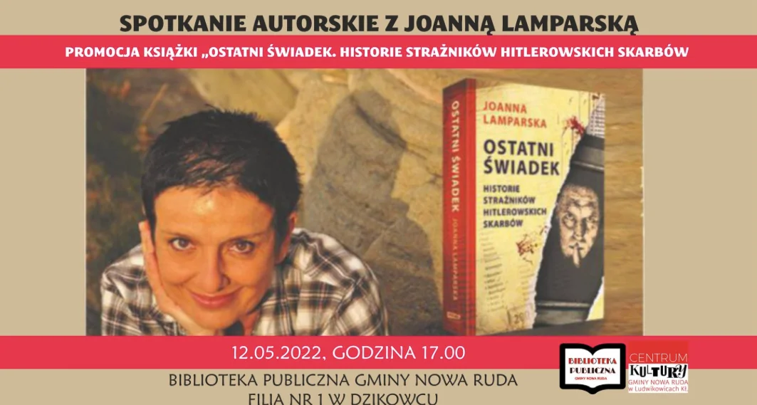Filia Gminnej Biblioteki Publicznej w Dzikowcu oraz Centrum Kultury Gminy Nowa Ruda zapraszają interesujących się historią naszego regionu na spotkanie autorskie z pisarką, dziennikarką i autorką przewodników po dolnośląskich zabytkach Joanną Lamparską.