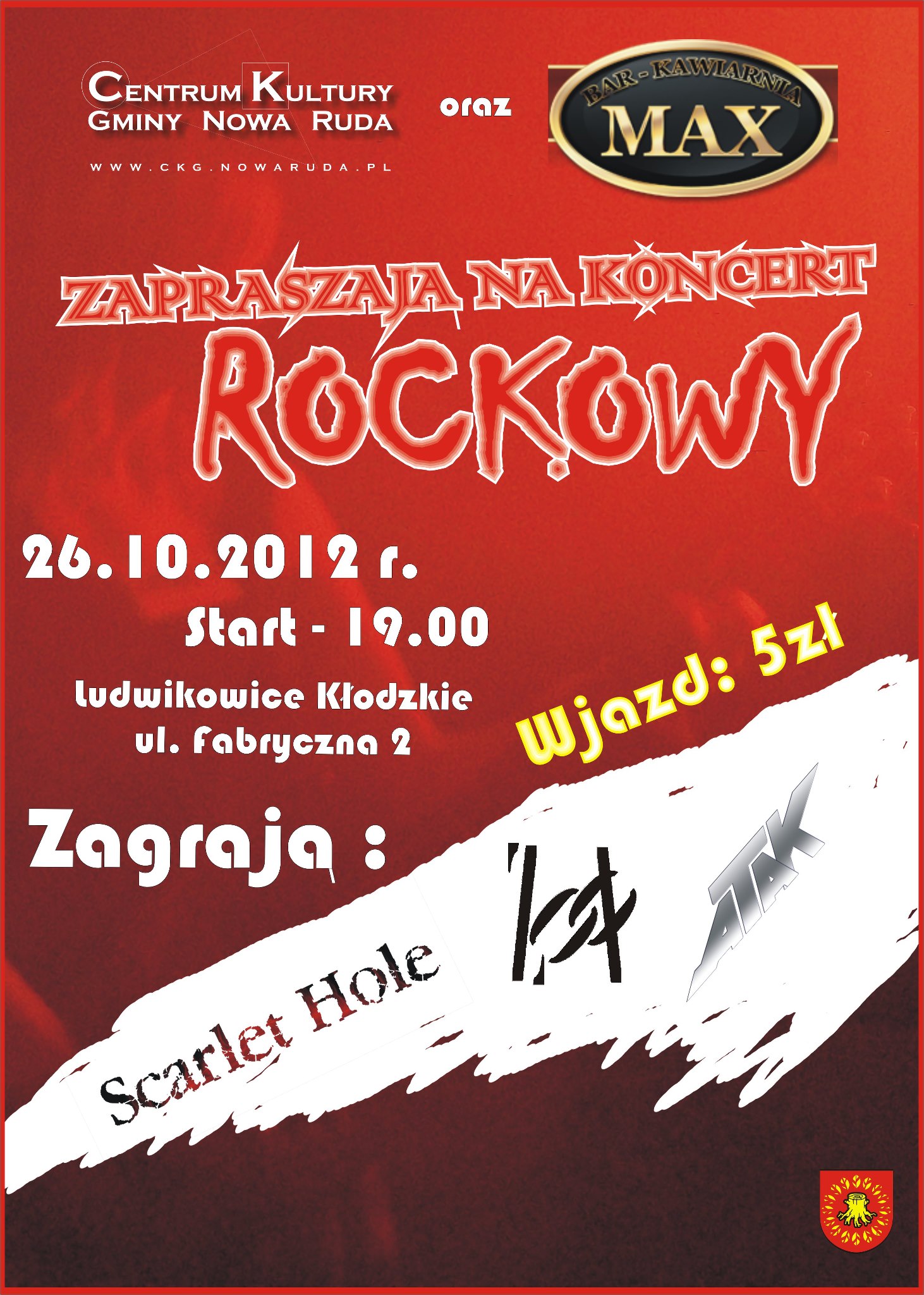 Lokalne zespoły rockowe Scarlet Hole oraz Zooi a także gościnnie opolski Atak zagrają 26 października o godz. 19.00 w Klubie MAX w Ludwikowicach Kłodzkich (ul. Fabryczna 2). Wstęp płatny w cenie 5 zł
