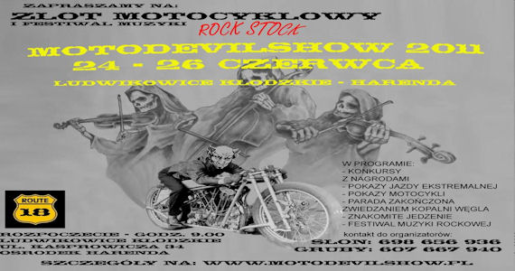W dniach 24-25.06.2011 Centrum Kultury Gminy Nowa Ruda oraz Pub "Izi Rajder" ze Świdnicy zapraszają na teren ośrodka CRK Harenda w Ludwikowicach Kłodzkich, gdzie w przepięknych okolicznościach przyrody, nad brzegiem uroczego zalewu odbędzie się połączona edycja koncertów "Rock Stok" i zlotu motocykli "Moto Devil Show". Oprócz wielu atrakcji związanych z pokazami motocykli, konkursów itp. usłyszeć będzie można mnóstwo zespołów z Polski i Czech. Mamy nadzieję, że dopisze zarówno pogoda jak i publiczność. Program imprezy poniżej.
