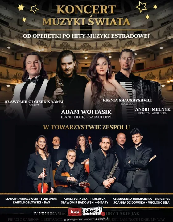 W tę muzyczną podróż zabierze nas wyjątkowa, 10-osobowa grupa muzyków i solistów pochodząca z różnych krajów Europy. Wyjątkowe aranże, nieznane dotąd wersje znanych i uwielbianych utworów usłyszymy i zobaczymy na żywo! Artyści zaprezentują między innymi Libertango (Akordeon), Arie ze Skrzypka na dachu, hity operetkowe, muzykę z filmu "Piraci z Karaibów" oraz "Zapach Kobiety", Piosenkę Francuską (Edith Piaf) Ujmujące Ballady Gruzińskie jak i Włoskie przeboje w wiązance Volare, My way i wiele innych, które pozostaną niespodzianką do dnia koncertu.