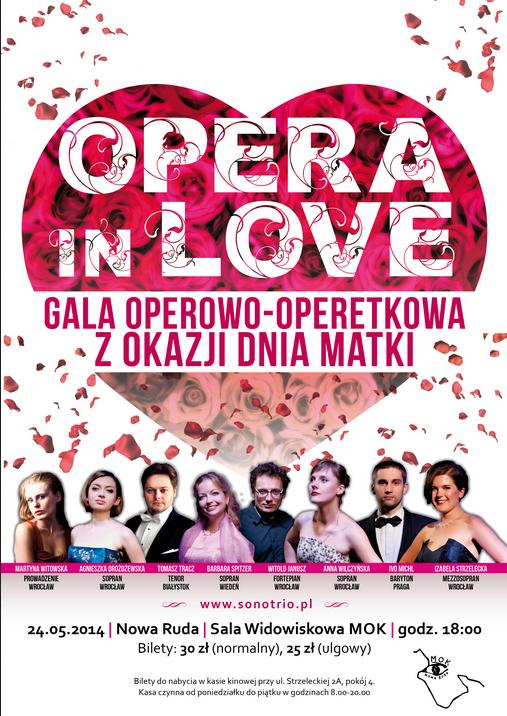Wyjątkowy prezent muzyczny z okazji Dnia Matki przygotowała Międzynarodowa Grupa Operowa Sonotrio Ensemble. Gala Opera in Love prezentuje w barwnej oprawie scenicznej najpiękniejsze arie, duety i ansamble operowe i operetkowe w wykonaniu śpiewaków scen operowych Austrii, Czech i Polski. Podczas koncertu zabrzmią liryczne romanse, brawurowe i efektowne popisy wokalne, ponadczasowe przeboje operetkowe i barwne sceny zespołowe z dzieł najsłynniejszych kompozytorów, m. in. Mozarta, Verdiego, Pucciniego, Moniuszki, Delibesa, Gounoda, Offenbacha, Straussa, Kalmana, Gershwina. Nie zabraknie tak znakomitych kompozycji, jak: Mamma i O sole mio z repertuaru neapolitańskiego, przejmującej arii Halki Gdyby rannym słonkiem, nastrojowego Duetu Kwiatów, żartobliwej Arii Lalki z opowieści Hoffmanna, uwodzicielskiej Carmen i wielu innych. Całość zostanie oprawiona słowem wiodącym. Zapraszamy na niepowtarzalny wieczór operowy w towarzystwie wspaniałych głosów!