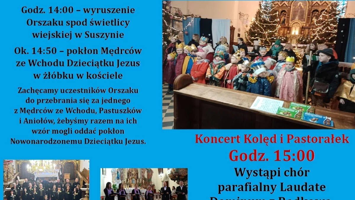 Orszak Trzech Króli przejdzie 6 stycznia z Suszyny do Kościoła Parafialnego. O godz. 14.00 ruszy spod świetlicy wiejskiej w Suszynie, by niecałą godzinę później, o 14.50, Mędrcy ze Wschodu mogli złożyć pokłon Dzieciątku Jezus w żłobku, który znajduje się w kościele. O godz. 15.00 wystąpi chór parafialny Laudate Dominum z Radkowa, Rodzinny zespół Kameralny z Tłumaczowa oraz kapela Harnasie z Wambierzyc.