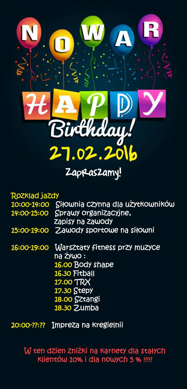 Wszystkich serdecznie zapraszamy na wspólne świętowanie. Na terenie siłowni obędą się zawody z nagrodami zarówno dla Pań i Panów z podziałem na stopnie zaawansowania Zajęcia fitness i warsztaty przy muzyce na żywo. Wspólna impreza na terenie kręgielni.