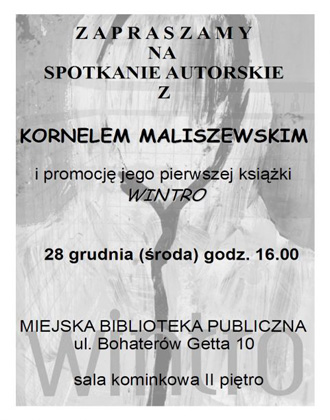 KulturaMiejska Biblioteka Publiczna w Nowej Rudzie na spotkanie autorskie z Kornelem Maliszewskim, który zadebiutował książką pt. "Wintro". Spotkanie odbędzie się w Sali Kominkowej biblioteki dnia 28 grudnia o godz. 16.00.
