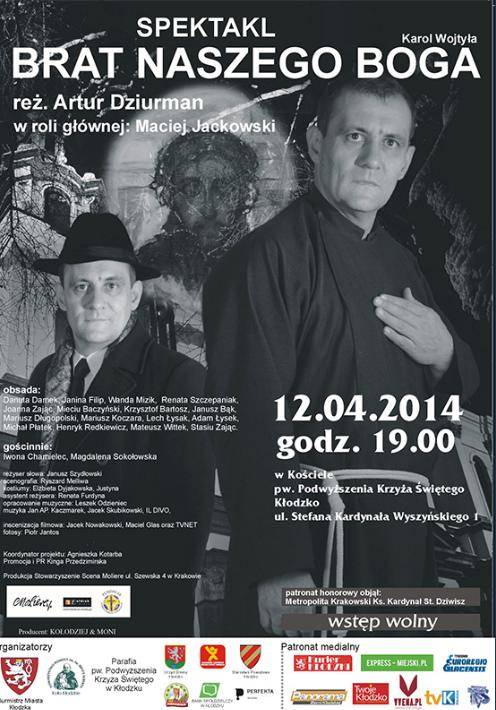 Za niecały miesiąc beatyfikacja Jana Pawła II. Z tej okazji w kościołach w całej diecezji odbywają się różne wydarzenia mające na celu przygotowanie duchowe wiernych do tej uroczystości. Do niecodziennego wydarzenia dojdzie w sobotę, 12 kwietnia w kościele pw. Podwyższenia Krzyża Św. w Kłodzku. Punktualnie o godz. 19.00 rozpocznie się tam spektakl teatralny „Brat naszego Boga” w reżyserii Artura Dziurmana. Jego autorem był Karol Wojtyła. - Jest to utwór o istnieniu dwóch powołań w jednym człowieku. Główny bohater Adam Chmielowski odczuwa powołanie do sztuki i do niesienia pomocy potrzebującym. Wywołuje to w nim rozdarcie wewnętrzne. Ostateczną decyzję podejmuje oglądając swój obraz Ecce homo. W wizerunku Chrystusa odnajduje miłosierdzie i odpowiedzialność za ubogich. Adam Chmielowski przemienia się w Brata Alberta i zakłada zgromadzenie zakonne Braci Albertynów. W utworze pojawia się też problem rewolucji - mówią o spektaklu recenzenci teatralni. - Nieznajomy, który rozmawia z Adamem chce rewolucji skierowanej przeciwko bogatym, nastawionej na dobra materialne i polepszenie warunków bytowych ludzi. Adam natomiast uważa, że konieczna jest jeszcze "rewolucja" duchowa. W ostatniej scenie bracia zakonni rozmawiają z Bratem Albertem o buncie robotniczym przeciw uprzywilejowanym - dodają. W roli głównej wierni z całej ziemi kłodzkiej zobaczą Macieja Jackowskiego. Warto podkreślić, że wstęp na przedstawienie jest bezpłatny. U nas płatnie Co ciekawe, ten sam spektakl, ale już płatnie (bilety w cenie 30 zł) będzie można obejrzeć w Miejskim Ośrodku Kultury w Nowej Rudzie (ul. Strzelecka 2a). Zostanie wystawiony dzień później niż w Kłodzku, czyli w niedzielę, 13 kwietnia o godz. 17.00.