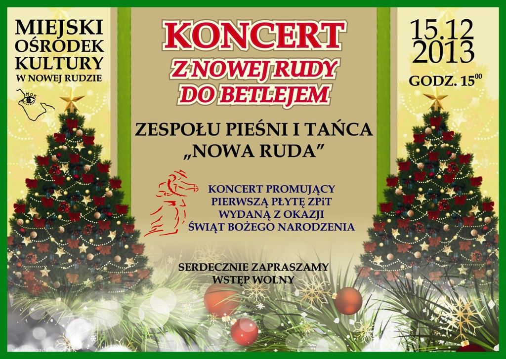 15 grudnia o godz. 15.00 w Miejskim Ośrodku Kultury w Nowej Rudzie wystąpi Zespół Pieśni i Tańca Nowa Ruda promujący pierwszą płytę ZPiT wydaną z okazji Świąt Bożego Narodzenia. Wstęp wolny!