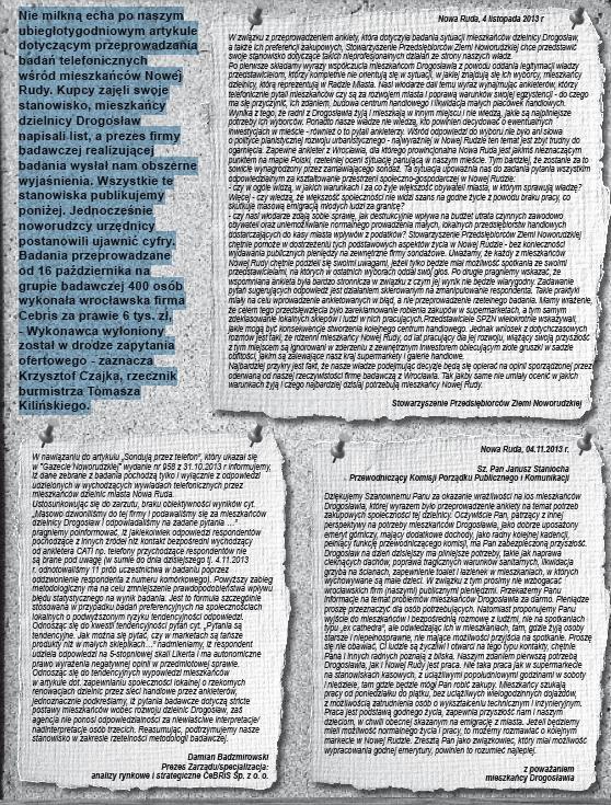 Nie milkną echa po naszym ubiegłotygodniowym artykule dotyczącym przeprowadzania badań telefonicznych wśród mieszkańców Nowej Rudy. Kupcy zajęli swoje stanowisko, mieszkańcy dzielnicy Drogosław napisali list, a prezes firmy badawczej realizującej badania wysłał nam obszerne wyjaśnienia. Jednocześnie noworudzcy urzędnicy postanowili ujawnić cyfry. Badania przeprowadzane od 16 października na grupie badawczej 400 osób wykonała wrocławska firma Cebris za prawie 6 tys. zł, - Wykonawca wyłoniony został w drodze zapytania ofertowego - zaznacza Krzysztof Czajka, rzecznik burmistrza Tomasza Kilińskiego.