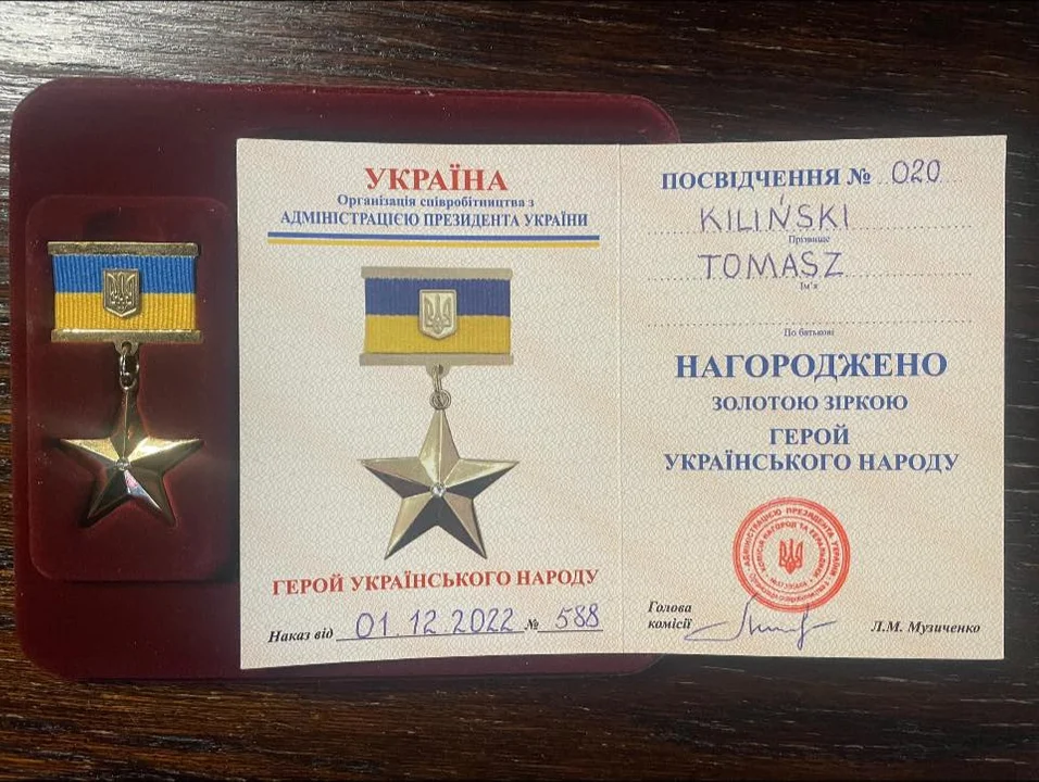 Nowa Ruda. Jak opisuje burmistrz Tomasz Kiliński niezwykłą niespodziankę sprawił mu jeden z ukraińskich mieszkańców Hotelu Parkowa - Aleksandr Kiian. Były pracownik administracji na Ukrainie, w imieniu prezydenta Ukrainy Władimira Zełeńskiego, wręczył mu odznaczenie „Bohater Narodu Ukraińskiego”, drugie odznaczenie ukraińskiej organizacji oraz książkę o Prezydencie Ukrainy.