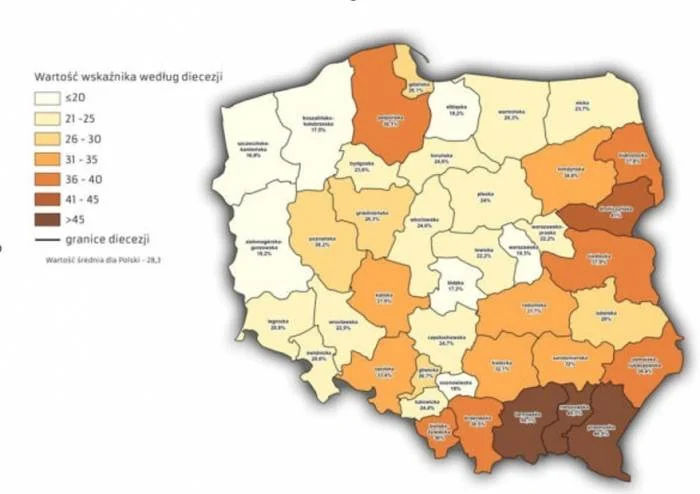 Najwyższy odsetek uczniów uczestniczących w lekcjach religii w szkole zanotowano w diecezjach tarnowskiej (97%), przemyskiej (97%) i rzeszowskiej (96%), podczas gdy najniższy odsetek wystąpił w diecezji wrocławskiej (63%) i warszawskiej (66%). W diecezji świdnickiej, w roku szkolnym 2021/2022, na lekcje religii uczęszczało 80,9% uczniów, co stanowi spadek w porównaniu z rokiem szkolnym 2020/2021, kiedy to było to 82% uczniów, oraz w stosunku do roku szkolnego 2019/2020, kiedy to uczestniczyło 83,5% uczniów, i roku szkolnego 2018/2019, kiedy to uczestniczyło 87,5% uczniów.