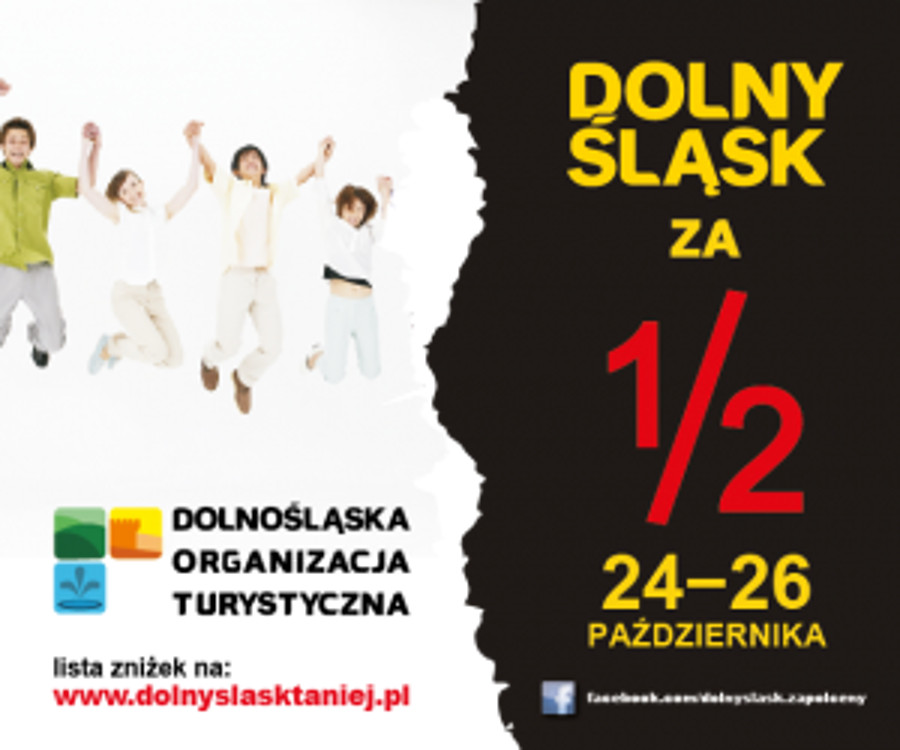 W dniach 24-26 października (weekend) będzie można zwiedzić dolnośląskie atrakcję za połowę ceny. Do akcji włączyli się m.in.: 1. Rodzinny Park Rozrywki Esplanada w Szklarskiej Porębie – 50% zniżki na jednoprzejazdowe bilety na Wieżę Emocji i kolejkę Alpine Coaster cena normalna 9 zł / cena z 50% rabatem 4,5 zł; 2. Muzeum Karkonoskie Jelenia Góra- w ramach akcji „Dolny Śląsk za pół ceny” Muzeum Karkonoskie w Jeleniej Górze wraz z 2 oddziałami, tj. Muzeum Historii i Militariów oraz Muzeum Zamek w Bolkowie, obniży ceny wejściówek o 50 %, bilet normalny będzie kosztował 3.5 zł, bilet ulgowy 2 zł. 3. Miejskie Muzeum Zabawek oraz Park Bajek w Karpaczu – za wejście do Muzeum zapłacimy 5 zł za bilet normalny i 2,5 zł za bilet ulgowy, a w Parku Bajek 5 zł za osobę dorosłą i 4 zł za dziecko od 2-16 roku życia. 4. Park Linowy „Wieżyca” w Sobótce – ceny w trakcie akcji: trasa mini – 5 zł/1 godz., trasa dziecięca – 7,50 zł za 1 przejście, trasa średnia – 10 zł za 1 przejście i trasa trudna – 15 zł za jedno przejście. 5. Muzeum Papiernictwa w Dusznikach Zdroju – w trakcie akcji bilet normalny – 5,50 zł, bilet ulgowy – 4 zł, bilet rodzinny – 13.50 zł, bilet grupowy – 5 zł, usługa przewodnicka – 20 zł, a warsztaty czerpania papieru – 5,50 zł 6. Spływy pontonowe w Bardzie – bilety normalne 38 zł po rabacie 19 zł, bilety ulgowe 28 zł po rabacie 14 zł (dzieci, studenci, emeryci, renciści) bilety rodzinne 2+2 w cenie 100 zł po rabacie 50 zł (dwie osoby dorosłe i dwoje dzieci do 16 roku życia. 7. Podziemne miasto Osówka – bilety przed obniżką kosztują 14 zł normalny i 12 zł ulgowy, zaś odkrywanie podziemnego miasta za 20 zł. 8. Kopalnia -Muzeum w Nowej Rudzie – Oferta zawierająca pakiet usług, która będzie obniżona o 50% w stosunku do ceny cennikowej. Bilety na wejścia do podziemnej trasy turystycznej w określonym terminie kosztować będą: bilet normalny- 7,50 zł i bilet ulgowy- 6 zł. 9. Muzeum Techniki w Jaworzynie Śląskiej – bilety przed obniżką kosztują 11 zł bilet normalny i 14 zł z przewodnikiem, a dla dzieci odpowiednio 9 zł i 11 zł. 10. Twierdza Srebrna Góra – Ceny biletów w ramach akcji Dolny Śląsk za pół ceny: normalny 7,50 zł, ulgowy 6 zł, rodzinny (2+2) 22,50 zł. Dzieci do 4 roku życia mają wstęp bezpłatny. Bilet ulgowy dotyczy: dzieci, młodzieży uczącej się, studentów, emerytów i rencistów. 11. Wieża Widokowa na Wielkiej Sowie – bilety przed obniżką kosztują 4 zł normalny i 2 zł ulgowy. 12. Zamek Książ w Wałbrzychu – za zwiedzanie z przewodnikiem polskim zapłacimy 12,50 zł za trasę barokową (9 zł bilet ulgowy) i 15 zł za trasę od Piastów od tajemnic II wojny światowej (11 zł bilet ulgowy). Bez przewodnika zwiedzimy Palmiarnię za 4 zł (2,50 zł bilet ulgowy), Tarasy wraz z Palmiarnią za 7,50 zł (5 zł bilet ulgowy), a wraz z salami zamkowymi za 12,50 zł (9 zł bilet ulgowy). oraz wielu innych partnerów Źródło: www.dolnyslasktaniej.pl