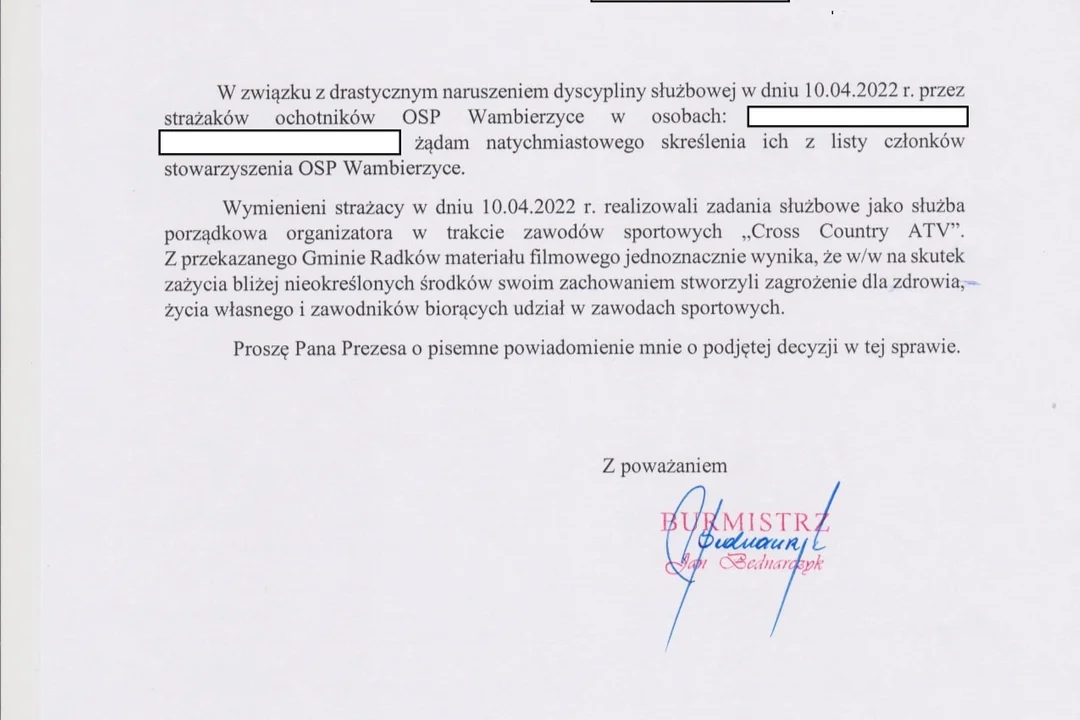 Jan Bednarczyk wysłał wczoraj w tej sprawie pismo do prezesa OSP Wambierzyce. Burmistrz żąda natychmiastowego usunięcia druhów ze służby.