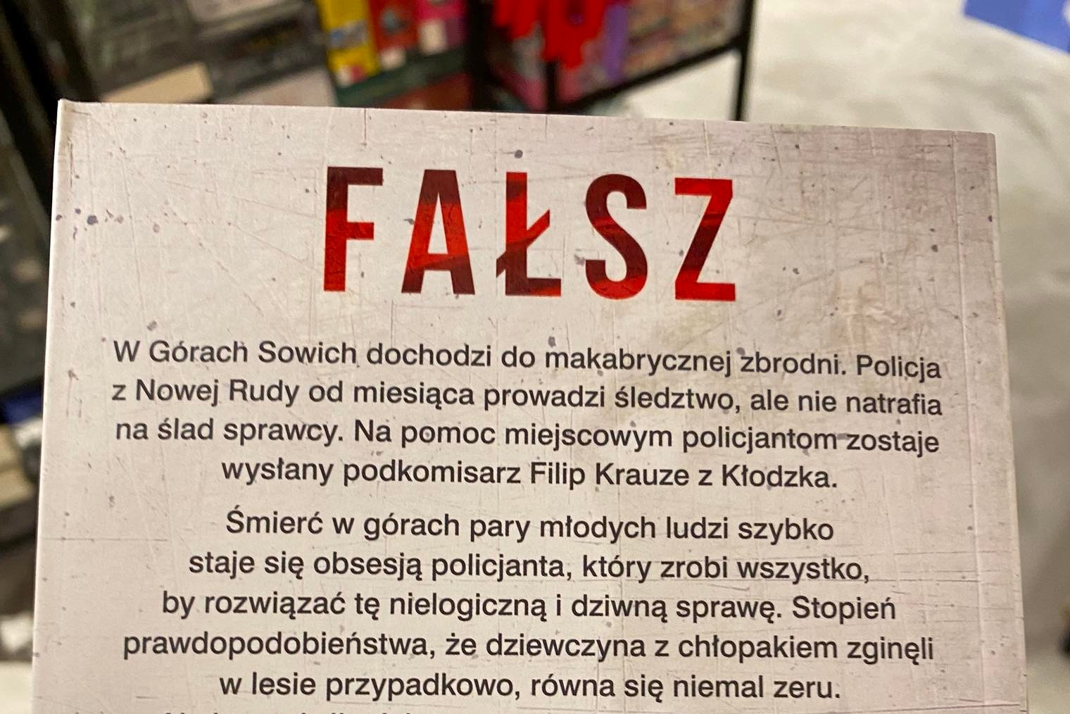 Fałsz to druga powieść z cyklu kryminalnego o podkomisarzu Filipie Krauze i aspirancie Igorze Fijałkowskim z Dolnego Śląska. W Górach Sowich dochodzi do makabrycznej zbrodni. Policja z Nowej Rudy od miesiąca prowadzi śledztwo, ale nie natrafia na ślad sprawcy. Na pomoc miejscowym policjantom zostaje wysłany podkomisarz Filip Krauze z Kłodzka, któremu na rękę jest chwilowy wyjazd z domu. Śmierć w górach pary młodych ludzi szybko staje się obsesją policjanta, który zrobi wszystko, by rozwiązać tę nielogiczną i dziwną sprawę, w której nie ma żadnych świadków…