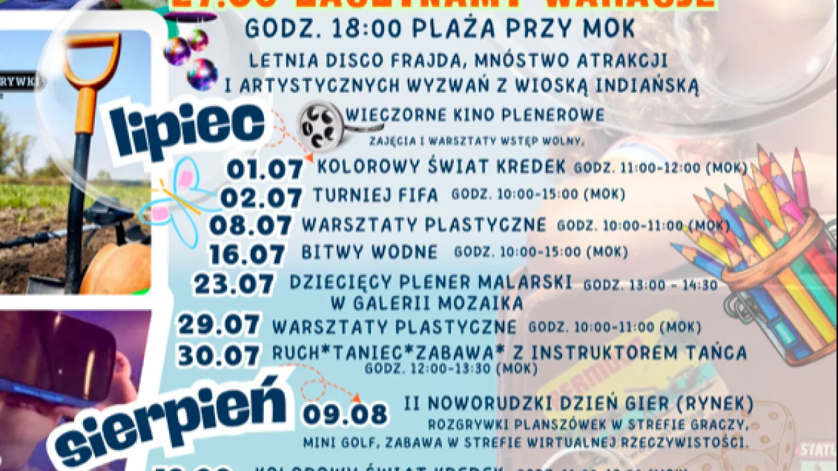 A co jeszcze w planach? W lipcu dzieci mogą wziąć udział m.in. w „Kolorowym Świecie Kredek", turnieju FIFA czy letnim kinie plenerowym. W sierpniu czekają m.in. Noworudzki Dzień Gier (9 sierpnia), gry terenowe, warsztaty VR i kolejne spotkania z plastyką i tańcem.