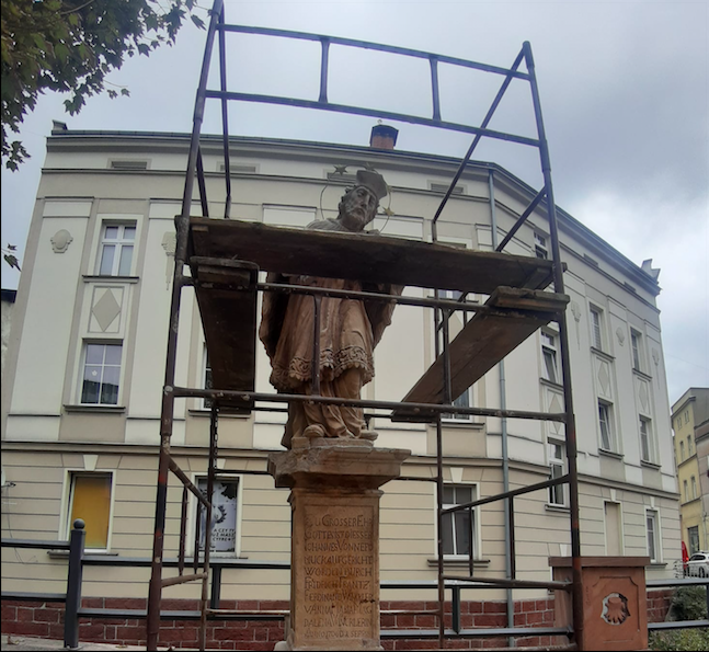 Nowa Ruda. Rozpoczęła się rewitalizacja trzech rzeźb św. Jana Nepomucena w mieście. Pierwsza z nich to rzeźba św. Jana Nepomucena zlokalizowana przy skrzyżowaniu ul. Fredry i ul. Cmentarnej. Prace, które zostaną przy nim wykonanie będą polegały na: oczyszczeniu aureoli z nawarstwień korozyjnych, rekonstrukcji brakującej gwiazdy na wzór zachowanych, a także na oczyszczeniu powierzchni kamienia z nawarstwień organicznych, czy rekonstrukcja ubytków. Kolejna figura św. Nepomucena znajduje się przy ul. Radkowskiej. Z kolei na ul. Bohaterów Getta przeniesiona zostanie figurka Św. Jana Nepomucena z okolic ul. Kolejowej. Władze Nowej Rudy i czeskiego Broumova pozyskały w sumie ponad 35 tys. Euro z Funduszy Europejskich na wspólne działania.U nas dzięki peiniadzom wyremontowane zostaną właś≥nie Nepomuceny, a w Broumovie wyremontują fontannę w parku Schrolla.
