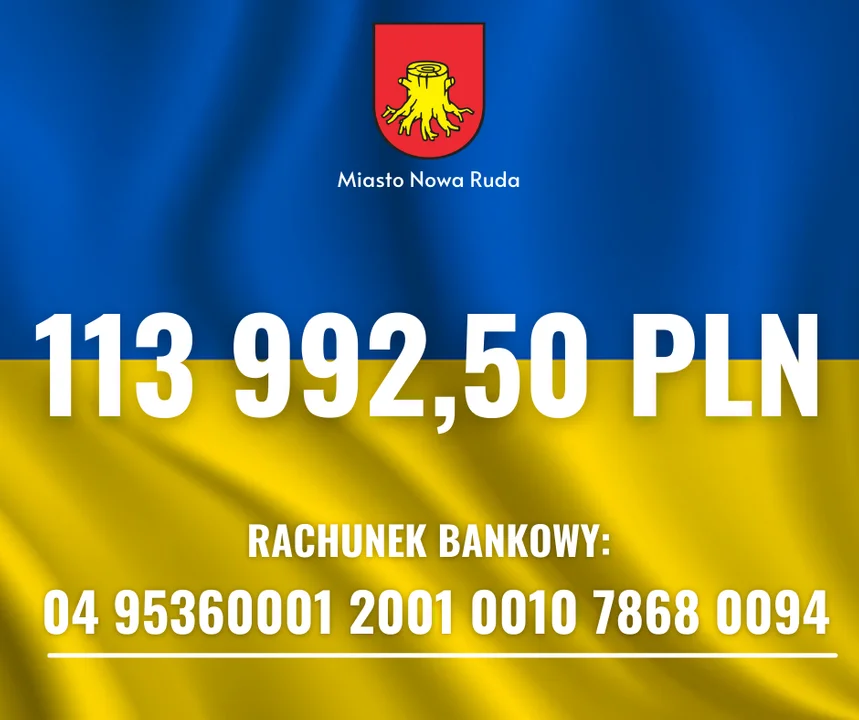 Nowa Ruda. Urząd Miejski informuje, że na specjalnie utworzonym koncie bankowym, z którego środki w całości przeznaczone są na pomoc dla przebywających w naszym mieście uchodźców z Ukrainy, na dziś zgromadzono 113 992,50 zł.