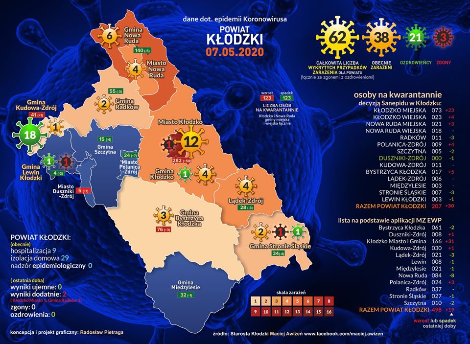 Wczoraj (czwartek, 7 maja) w powiecie kłodzkim odnotowano kolejne zakażenia koronawiusem. Zachorowały dwie osoby. To mieszkaniec gminy Radków, który był pacjentem szpitala w Kłodzku. Został on przewieziony do szpitala zakaźnego oraz mieszkanka Kłodzka z objawami, która została przebadana przez ZOZ i skierowana na kwarantannę domową.