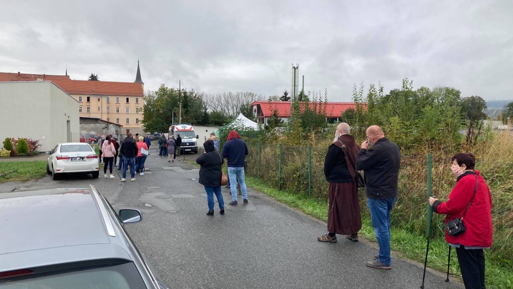 Oblężony wymazobus, pacjenci czekają w deszczu