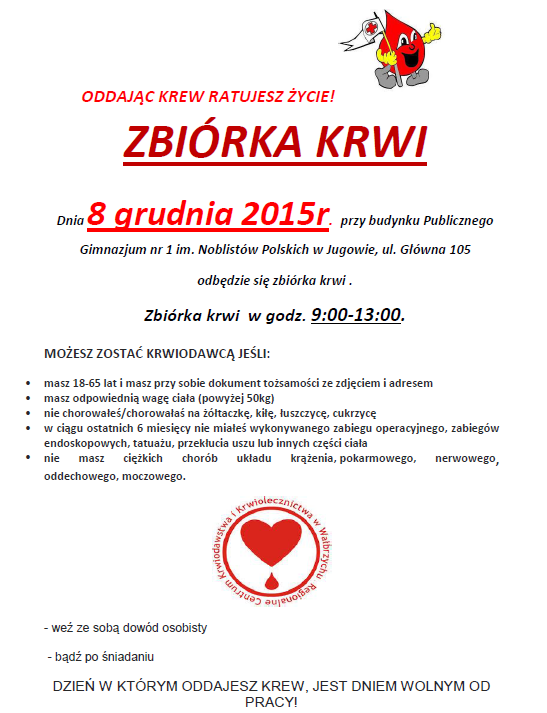 WiadomościW Jugowie 8 grudnia w godz. 9:00-13:00 możesz oddać krew i pomóc potrzebującym