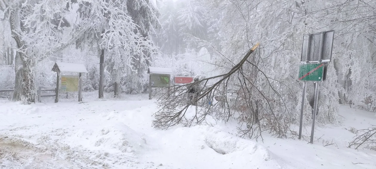 Przez ostatnie dni utrzymuje się mgła lub pada mżawka, która zwiększa obciążenie drzew i powoduje stopniowe wychylenie ich od pionu. Przy silnym nachyleniu następuje łamanie pni na różnych wysokościach- od wierzchołka po odziomek. Na szlaki leśne mogą spadać gałęzie i czubki drzew.