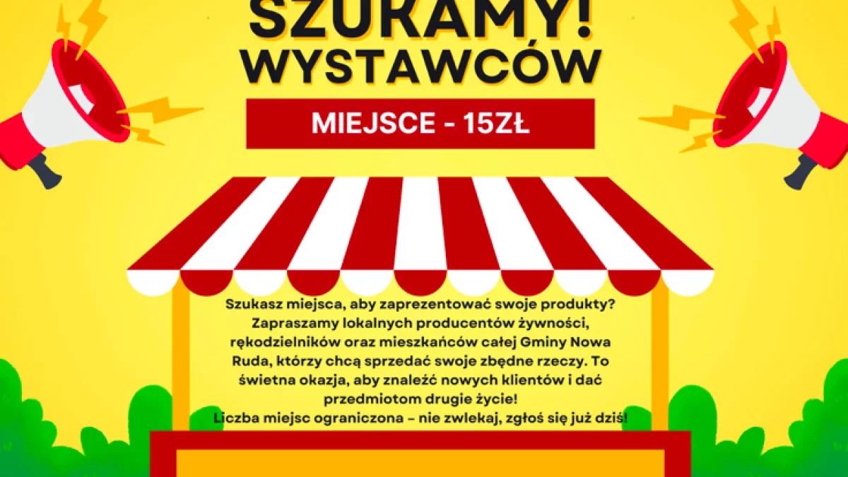 Organizatorzy poszukują chętnych wystawców, którzy chcieliby zaprezentować swoje produkty. Koszt wynajęcia miejsca na targu to 15 zł. To doskonała okazja, aby nie tylko zarobić, ale też pozbyć się zbędnych rzeczy z garażu, strychu czy piwnicy, a przy okazji znaleźć nowych klientów i spędzić miło czas w lokalnym gronie.