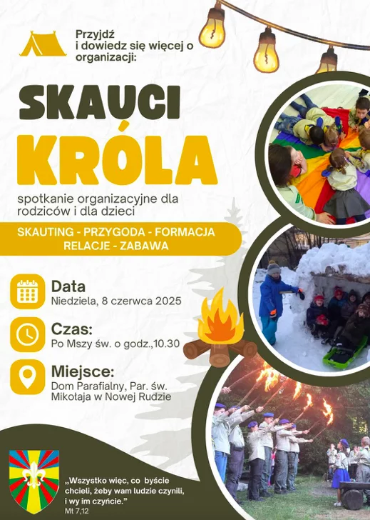 Nowa Ruda może zyskać wyjątkową inicjatywę dla dzieci i młodzieży. Już w najbliższą niedzielę po Mszy Świętej o godzinie 10.30 odbędzie się spotkanie informacyjne dla rodziców i opiekunów zainteresowanych powstaniem nowego szczepu Skautów Króla przy parafii.