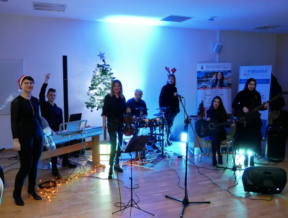 Przepiękną oprawę zapewnił zespół muzyczny LINGUA MUSICA, który tworzą studenci filologii angielskiej pod kierownictwem dr Aliny Bryll. Muzycy zaprezentowali znane na całym świecie utwory świąteczne w j. angielskim, jak np. „Silent Night”. Uczestnicy bardzo chętnie zaangażowali się we wspólne kolędowanie, a na koniec spotkania otrzymali słodkie upominki i zaproszenie na Koncert Bożonarodzeniowy studentów i wykładowców Wydziału Jazzu.