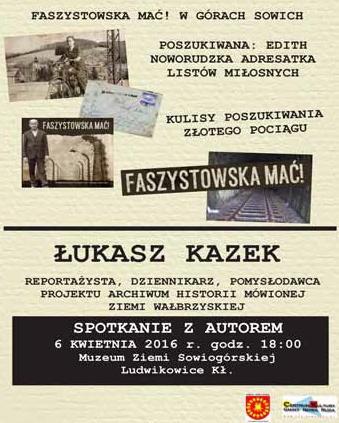Serdecznie zapraszamy Państwa na spotkanie z dziennikarzem, reportażystą i pomysłodawcą projektu Archiwum Historii Mówionej Ziemi Wałbrzyskiej, Łukaszem Kazkiem. Spotykamy się w Ludwikowicach, by razem zgłębiać historię naszego tajemniczego regionu, poznać opowieści i wspomnienia osób, których relacje są cennym przekazem dla przyszłych pokoleń. Serdecznie zapraszamy wszystkich mieszkańców, sympatyków historii oraz wszystkich zainteresowanych regionem, w którym żyjemy. Miejsce spotkania: Ludwikowice Kł., Muzeum Ziemi Sowiogórskiej. Widzimy się w środę 6 kwietnia o godz. 18.00. Centrum Kultury Gminy Nowa Ruda zaprasza
